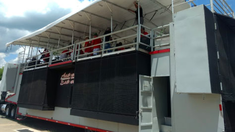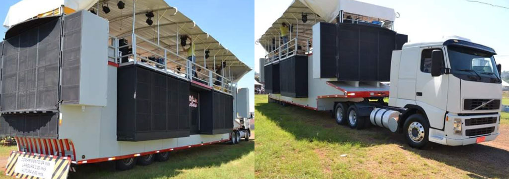 Feito em Salvador com carreta 03 eixos, gerador de 180 KVA, 01 camarim, 02 banheiros e sonorização de 120 mil Watts de potência.